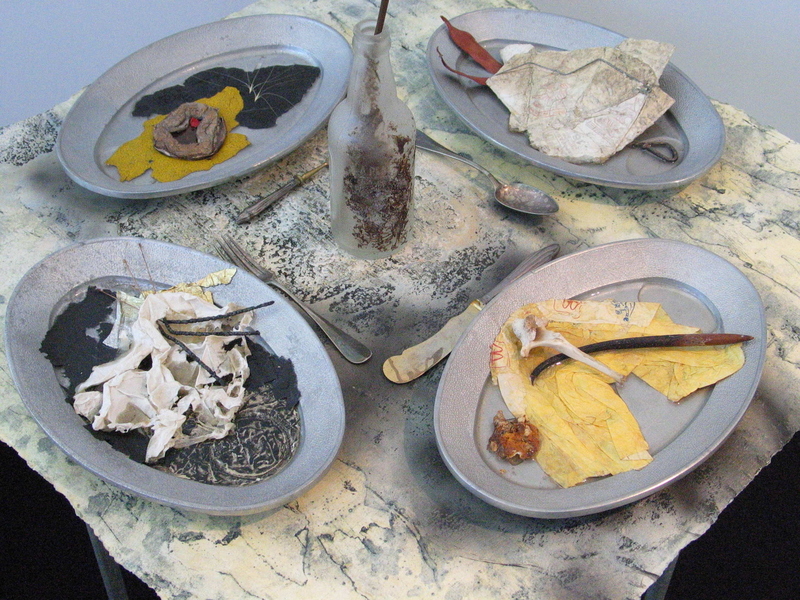 Mixed media assemblage on table
